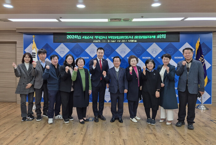 경기 부천시는 최근 시청 나눔실에서 '2024년 제2차 여성친화도시 조성협의체' 회의를 개최했다. 이번 회의에서는 여성친화 사업에 대한 자문 및 정책 개선 사항에 대한 의견을 개진했다. 사진은 여성친화도시 조성협의체 회의 참석자들이 기념촬영을 하고 있는 모습. (사진=부천시청 제공)