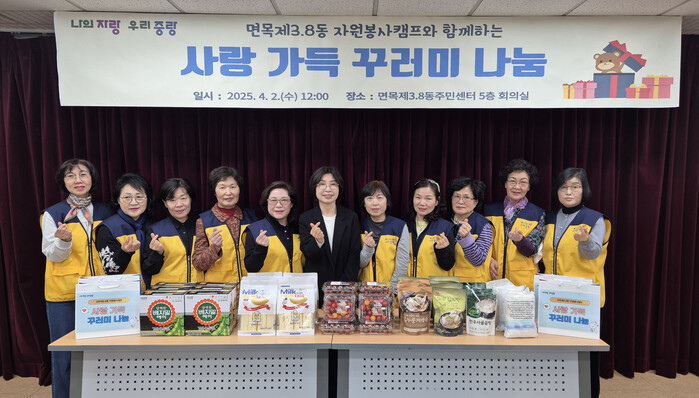 최근 중랑구 면목제3·8동자원봉사캠프 주관으로 ‘사랑 가득 꾸러미 나눔’ 행사가 개최돼 지역내 취약계층 노인들에게 건강에 도움이 되는 식료품 꾸러미 20개가 전달됐다. 사진은 관계자들이 기념촬영을 하고 있는 모습. (사진=중랑구청 제공)