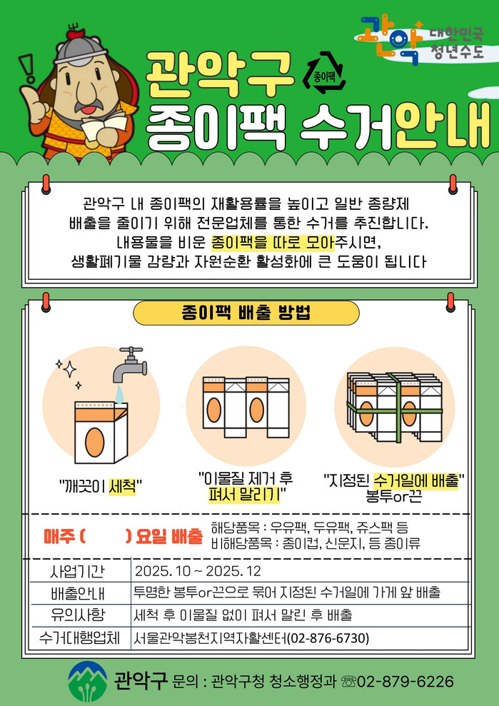 [시민일보 = 문민호 기자] 서울 관악구(구청장 박준희)가 오는 12월 말까지 ‘종이팩 중점 수거사업’을 집중적으로 추진해, 종이팩의 재활용률을 높이고 일반 종량제 배출을 줄이는데 주력한다.