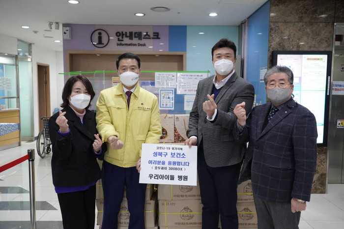 서울 성북구는 최근 성북우리아이들병원으로부터 성북구보건소 의료진 등 관계자를 격려하기 위해 천안호두과자 공장에서 직접 공수한 천안호두과자 300상자를 응원물품으로 전달받았다. 사진은 전달식에서 이승로 구청장(왼쪽 두 번째)이 관계자와 기념촬영을 하고 있는 모습. (사진제공=성북구청)