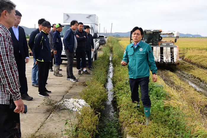 군 전역에서는 연일 지속된 강우로 특히 벼 도복 피해가 속출하고 있으며, 논바닥이 연약해지면서 콤바인 등 농기계의 진입이 어려워 수확이 지연되고 있다.