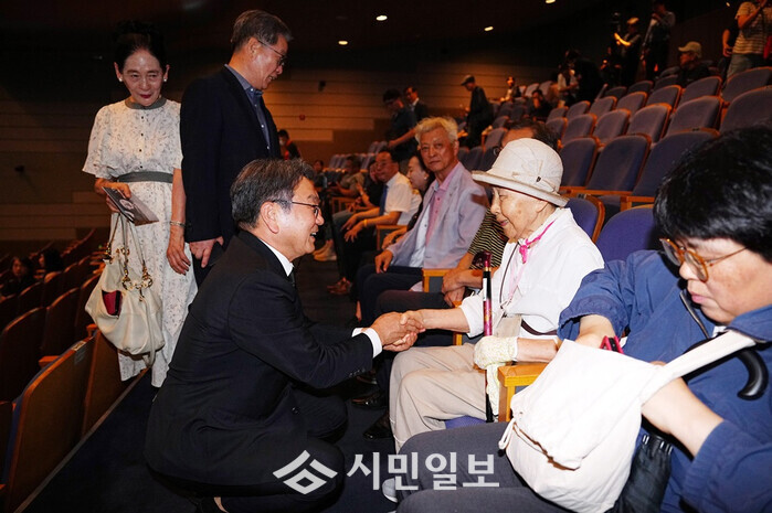 | ▲ 강기정 광주광역시장이 18일 오후 남구 빛고을시민문화관에서 열린 '김대중대통령 서거 16주기 추모식'에 참석해 시민들과 인사를 나누고 있다./광주광역시 제공 |