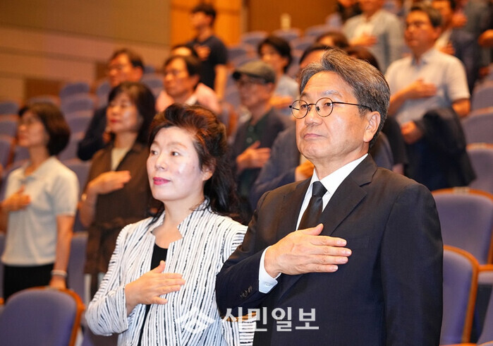 | ▲ 강기정 광주광역시장이 18일 오후 남구 빛고을시민문화관에서 열린 '김대중대통령 서거 16주기 추모식'에 참석해 국민의례를 하고 있다./광주광역시 제공 |