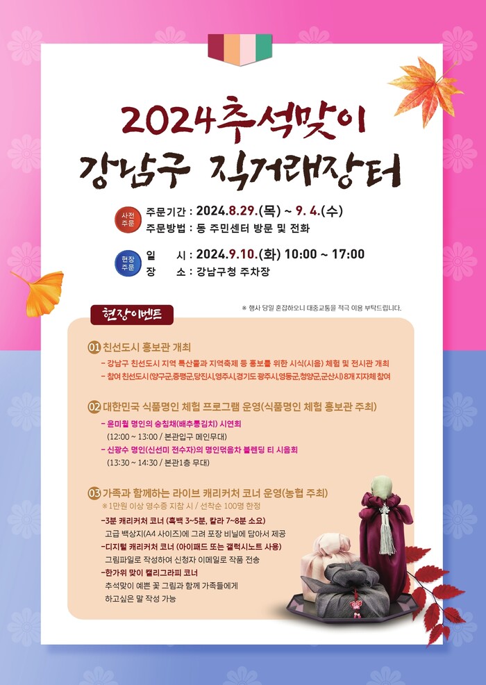 [시민일보 = 이대우 기자] 강남구(구청장 조성명)가 추석 명절을 맞아 오는 9월10일 오전 10시~ 오후 5시 구청 주차장에서 추석맞이 직거래장터를 개장한다.