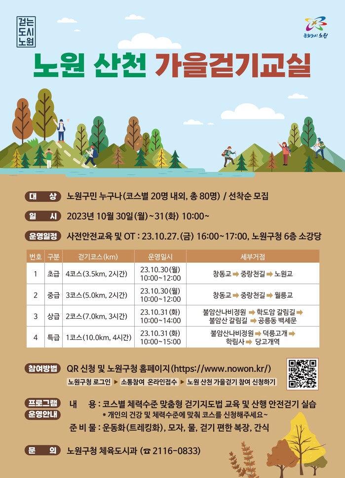[시민일보 = 홍덕표 기자] 노원구(구청장 오승록)가 오는 30일부터 31일까지 노원둘레산천길 일대에서 '노원 산천 가을걷기교실'을 운영한다.
