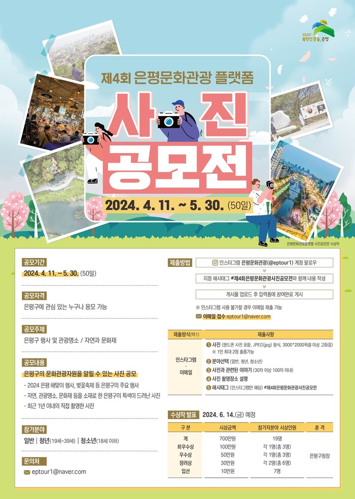 [시민일보 = 이대우 기자] 서울 은평구(구청장 김미경)는 문화관광 활성화를 위해 '제4회 은평문화관광 플랫폼 사진 공모전'을 오는 11일부터 5월 30일까지 50일 동안 진행한다고 밝혔다.
