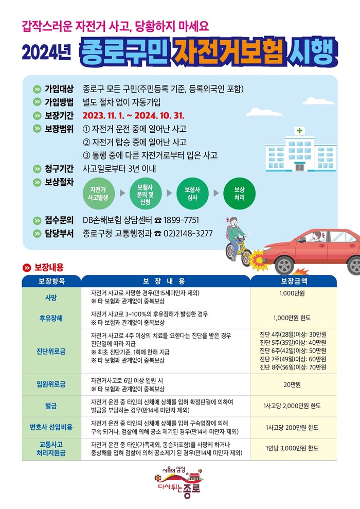 [시민일보 = 이대우 기자] 서울 종로구(구청장 정문헌)가 자전거 사고 위험으로부터 구민을 보호하기 위해 이달 1일부터 오는 2024년 10월까지 1년간 '종로구민 자전거보험'을 시행한다.