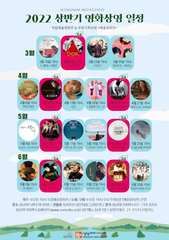 ‘독립예술영화관’은 전석 4천원으로 성남아트센터 홈페이지 내 영화예매 시스템을 통해 사전 예매를 진행하고 잔여석에 한해 현장 발권이 가능하다. ‘무료 기획상영’과 ‘야외상영회’는 성남미디어센터 홈페이지로 예약해야 한다.