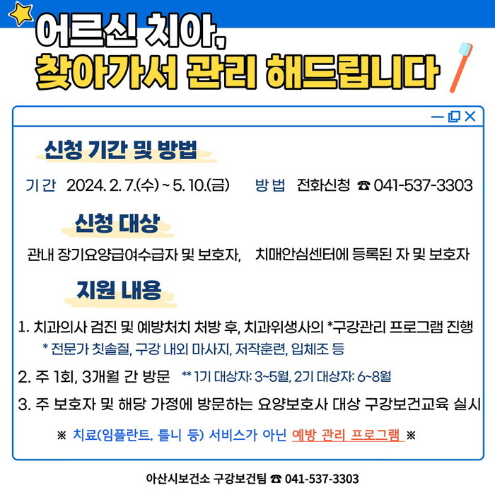 [아산=박명수 기자] 충남 아산시보건소 구강보건센터가 취약계층 노인들을 대상으로 오는 3월부터 예방을 중점으로 한 구강 관리 프로그램을 운영한다.