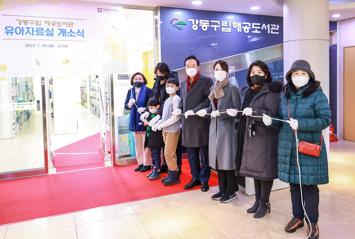 서울 강동구가 최근 강동구립 해공도서관 내 기존 매점 공간을 유아자료실로 리모델링해 온돌마루·유아용 서가 등을 설치해 유아 이용이 적합한 ‘유아자료실’의 문을 열었다. 사진은 해공도서관 유아자료실 개소식에서 관계자들이 제막식을 진행하는 모습. (사진제공=강동구청)