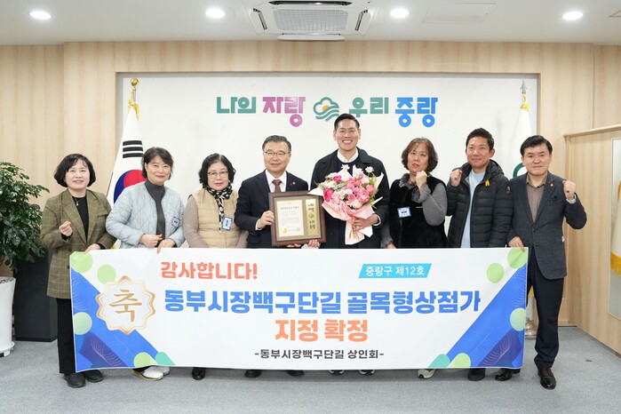 [시민일보 = 여영준 기자] 중랑구(구청장 류경기)가 ▲양원숲길(망우본동) ▲동부시장 백구단길(면목2동) ▲동부시장 미드랑길(상봉2동, 면목2동)을 제11·12·13호 골목형상점가로 신규 지정하고, 최근 ‘골목형상점가 지정서 수여식’을 개최했다.