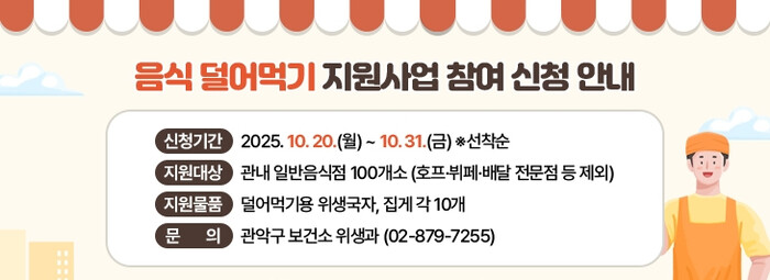 신청기간은 오는 31일까지이며, 선착순 마감한다. 신청방법은 관악구청 홈페이지에서 신청서를 내려받아 작성한 후, 관악구청 위생과 방문 또는 담당자 이메일로 제출하면 된다.