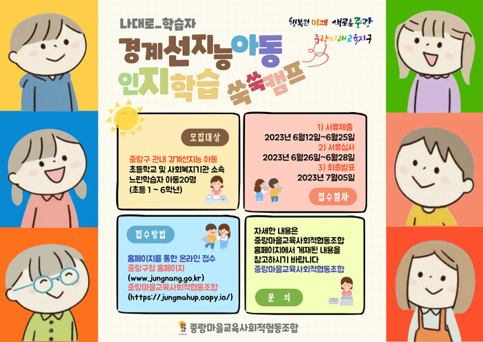 구에 따르면 중랑마을교육사회적협동조합이 진행하는 <‘나대로’ 인지학습 쑥쑥 캠프>는 지역 내 경계선 지능 아동들이 학습 능력을 키우고 사회 적응력을 기를 수 있도록 맞춤형 학습을 지원하는 사업이다.