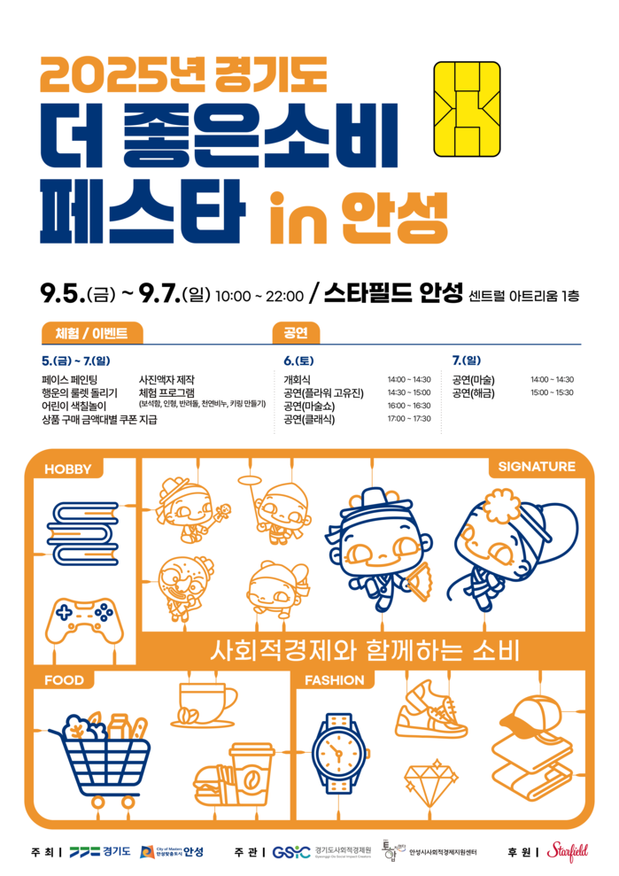 [안성=오왕석 기자] 안성시가 오는 9월 5일(금)부터 9월 7일(일)까지 3일간 오전 10시부터 오후 10시까지 스타필드 안성 센트럴 아트리움 1층에서 ‘2025 안성시 더 좋은소비 페스타’를 개최한다.