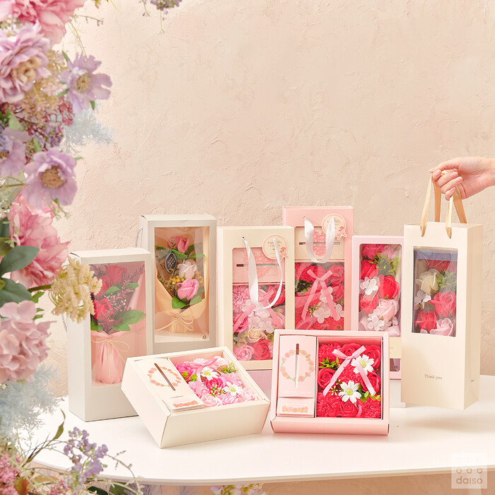 포장용품은 꽃다발이나 화분을 담을 수 있는 쇼핑백을 신상품으로 기획했다. ‘클리어 플라워 쇼핑백’은 투명한 재질의 쇼핑백이며, 두 가지 사이즈로 판매한다. 꽃다발이나, 화분, 인형 등을 크기에 맞게 선택을 하면 된다. ‘투명창 와인백’은 와인병을 넣어 선물할 수 있으며, 이번 기획전에서 판매하는 ‘비누꽃 꽃다발’도 담을 수 있는 사이즈다.
