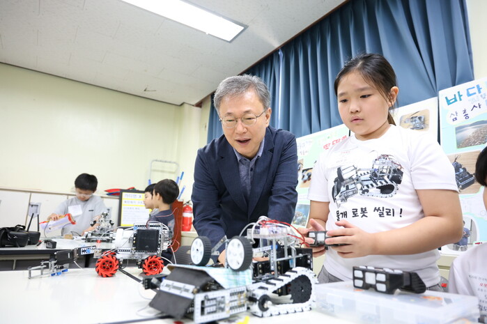 서울 구로구가 최근 유한공업고등학교에서 ‘제20회 전국학생로봇경진대회’를 개최했다. 해당 대회는 (사)한국학교로봇교육진흥회가 주관·주최하고, 구를 비롯해 교육부, 과학기술정보통신부, 광운대학교가 후원하는 전국 규모의 과학기술 경진 행사로 미래 과학기술 인재를 발굴하고 육성하기 위해 매년 열리고 있다. 사진은 장인홍 구청장이 대회 참가 학생들의 창의적인 로봇 창작 작품을 살펴보는 모습. (사진=구로구청 제공)