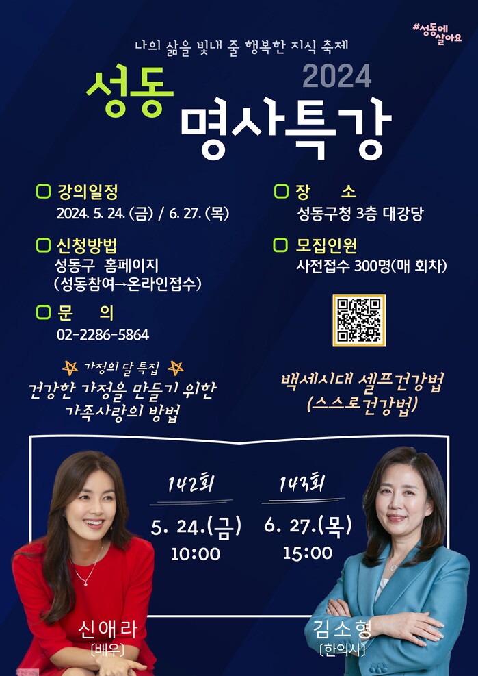 특강에 참여하고자 하는 구민은 성동구청 누리집(성동참여>온라인접수)에서 특강 전날 오후 6시까지 사전 신청하면 된다.