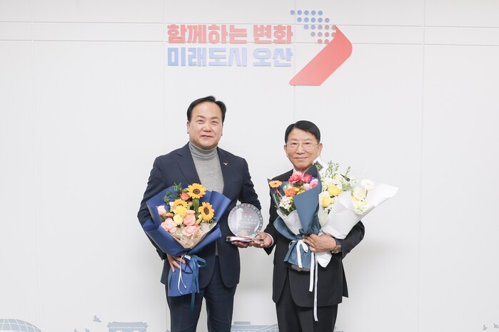 경기 오산시가 최근 전 화성오산재향군인회장을 역임하고 현재 유엔군 초전기념관 해설사로 활동 중인 표상옥씨를 ‘1일 명예시장’으로 위촉했다. 사진은 위촉식에서 이권재 시장(왼쪽)이 표씨와 기념 촬영을 하는 모습. (사진=오산시청 제공)