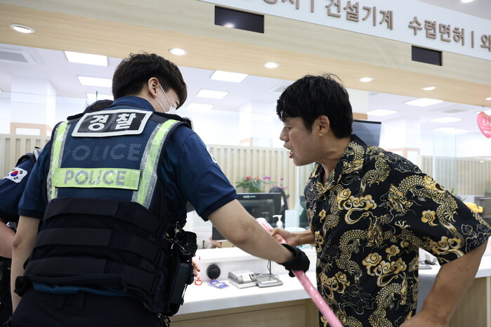 이날 모의훈련은 민원서류 발급 중 민원인의 돌발적인 폭언·폭행 상황을 가정해 구로경찰서와 합동으로 추진했다.