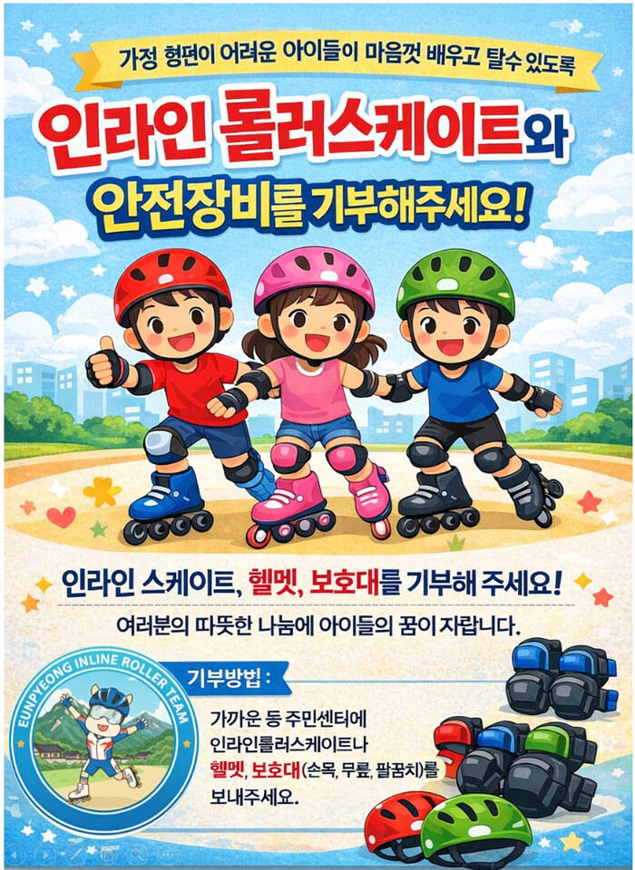 기부 대상 물품은 ▲아동용 인라인 롤러스케이트 ▲안전모 ▲손목·무릎·팔꿈치 보호대 등이며, 사용할 수 있는 상태의 장비라면 누구나 기부할 수 있다. 기부 물품은 가까운 동 주민센터 또는 은평구 생활체육과로 제출하면 된다.