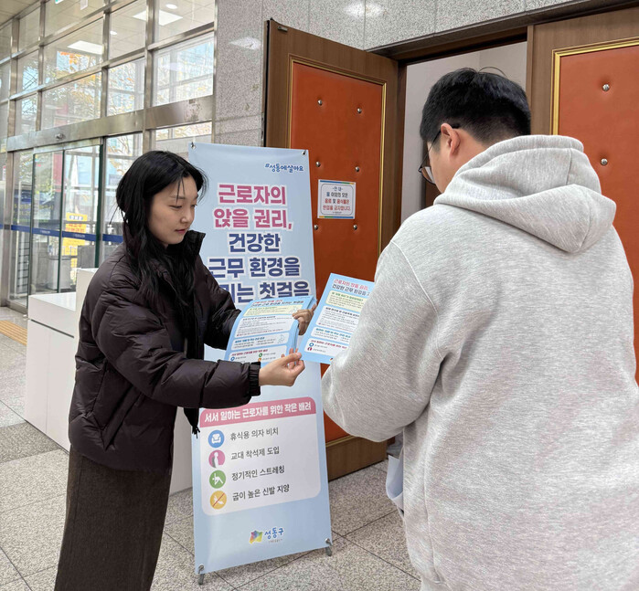 | ▲ 서서 일하는 근로자의 앉을 권리 증진을 위한 홍보캠페인 실시하고 있다. (사진=성동구청 제공) |