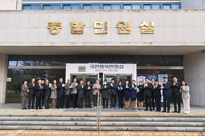 경기 하남시가 최근 ▲공간▲서비스 ▲체험 ▲만족도 등 4대 분야의 7개 지표, 25개 항목에서 우수한 평가를 받아 개청 이래 최초로 국민행복민원실 인증을 획득했다. ‘국민행복민원실’은 행정안전부가 수요자 중심의 편리하고 안전한 민원환경 조성을 위해 전국 지방자치단체, 교육청, 특별지방행정기관을 대상으로 평가를 진행해 우수기관을 인증하는 제도다. 사진은 신규 인증 현판 제막식에 참여한 이 시장이 관계자들과 기념 촬영하는 모습. (사진=하남시청 제공)