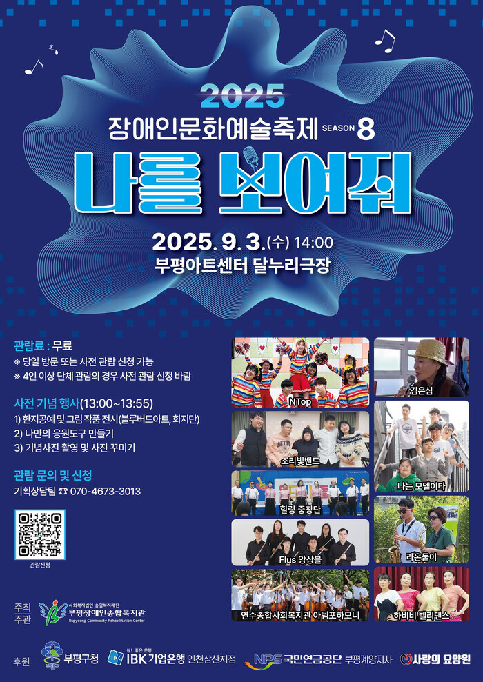 [인천=문찬식 기자] 인천 부평구 부평장애인종합복지관은 오는 9월3일 부평아트센터 달누리극장에서 2025년 장애인문화예술축제 ‘나를 보여줘-시즌8’을 개최한다.
