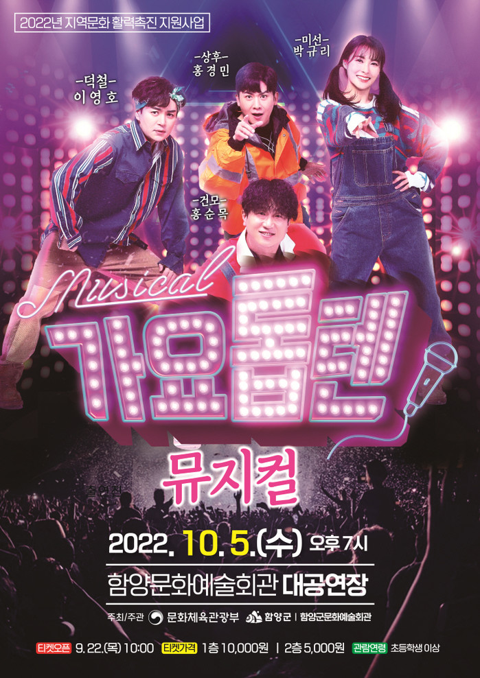 티켓 예매는 오는 22일 오전 10시부터 온라인(인터파크 및 함양문화예술회관 홈페이지, 10월 4일까지) 및 현장결제(문화예술회관 1층, 10월 5일 공연전까지)가 가능하며, 관람료는 1층 10,000원, 2층 5,000원이며 초등학생이상 관람이 가능하다.