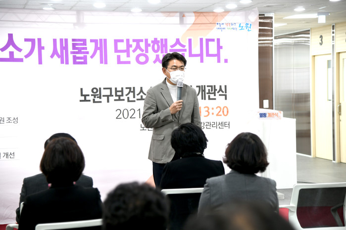 오승록 서울 노원구청장은 11일 ‘노원보건소 리모델링 개관식’에 참석해 2019년부터 진행한 리모델링의 완료를 축하하고, 코로나19방역관리에 적극 협조해준 관계자들에게 감사의 마음을 전달했다. 사진은 개관식에서 오 구청장이 축하말을 하고 있는 모습. (사진제공=노원구청)