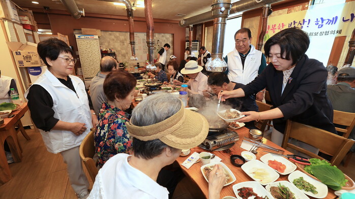 경기 과천시 과천동은 지난 26일 지역내 음식점인 신가네 광양불고기의 후원으로 지역내 저소득층 홀몸노인 등 50여명을 초청해 ‘행복한 밥상’ 나눔 행사를 진행했다. 사진은 이날 신계용 시장(오른쪽)이 노인들에게 음식을 그릇에 담아주고 있는 모습.(사진=과천시청 제공)