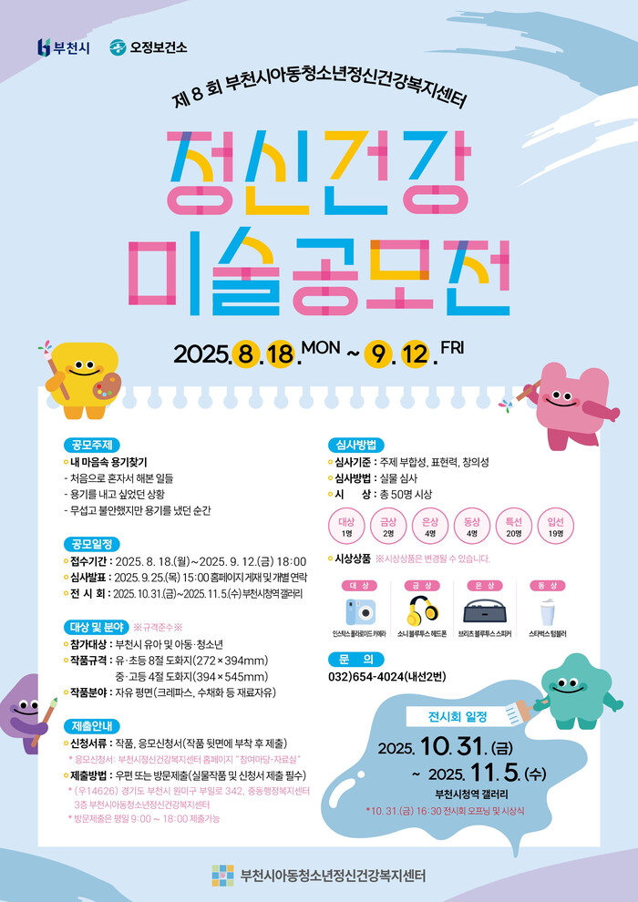 접수된 작품은 심사를 거쳐 총 50점을 선정한다. 수상 규모는 대상 1명, 금상 2명, 은상 4명, 동상 4명, 특선 20명, 입선 19명이다. 수상작은 9월25일 오후 3시 부천시정신건강복지센터 홈페이지를 통해 발표할 예정이다.