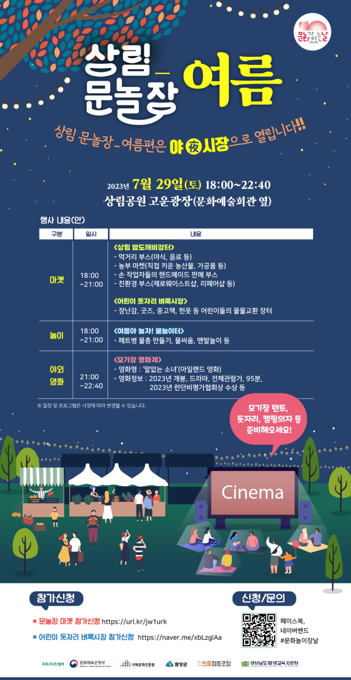 여름편인 이번 상림 문화놀이장날은 문화, 놀이, 마켓으로 운영되며, 마켓은 ‘상림 밤도깨비장터’와 ‘어린이 돗자리 벼룩시장’으로 운영되며, 놀이는 ‘여름아 놀자! 물놀이터’라는 주제로 페트병 물총 만들기, 물싸움, 맨발놀이 등 어린이들이 물과 함께 시원한 여름을 보낼 수 있도록 준비하고 있다.