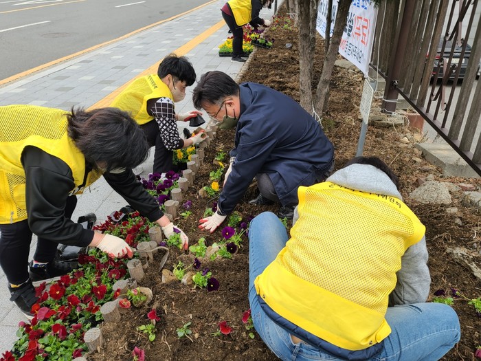 경기 광주시 곤지암읍 주민자치위원회는 23일 ‘봄맞이 꽃 심기’ 행사를 진행해 펜지 및 튤립 등 5300여본을 청사 입구내 화단에 식재했다. 사진은 이날 참여자들이 꽃을 식재하고 있는 모습. (사진제공=광주시청)