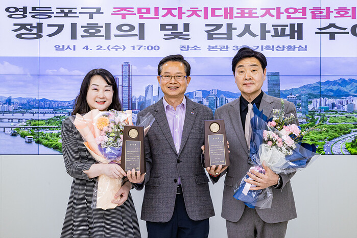 영등포구가 2일 주민자치대표자연합회 4월 정기회의 및 감사패 수여식을 진행했다. 사진은 최호권 구청장(가운데)이 감사패를 받은 연합회 관계자들과 기념촬영을 하고 있는 모습. (사진=영등포구청 제공)