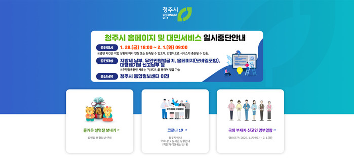 청주시 통합정보센터의 임시청사(문화제조창 2층) 이전을 위해 1. 28.(금) 18:00부터 2. 1.(화) 09:00시까지 모든 행정업무 및 대민서비스가 중단된다.