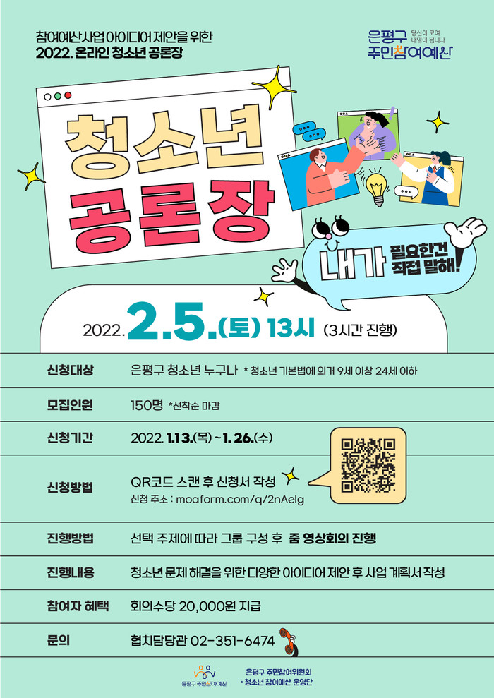 [시민일보 = 이대우 기자] 서울 은평구(구청장 김미경)는 오는 2월5일 ‘온라인 참여예산 청소년 공론장’을 개최한다고 밝혔다.
