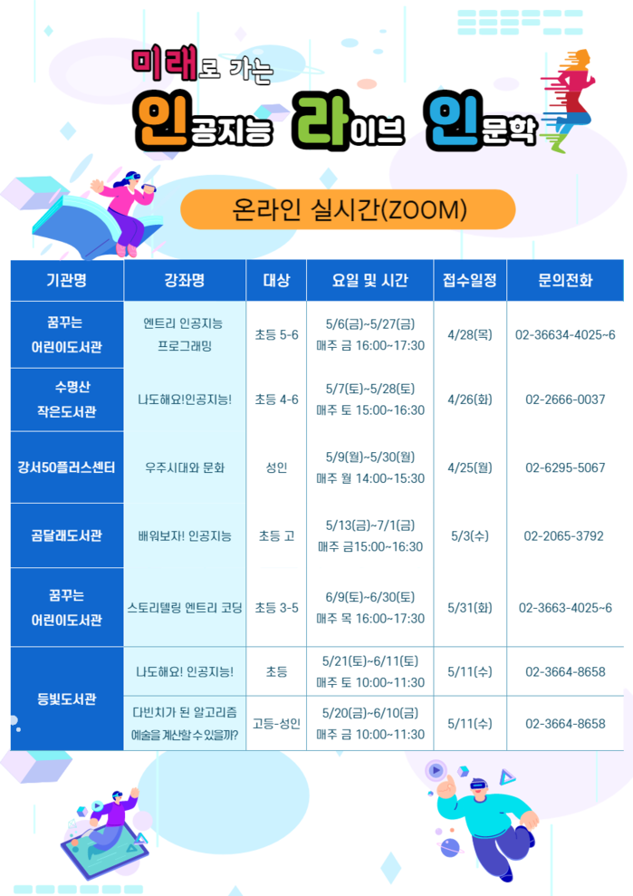 기관별로 ▲나도 해요! 인공지능! ▲배워보자! 인공지능 ▲우주시대와 문화 ▲다빈치가 된 알고리즘 등 초·중·고등학교 학생과 성인을 대상으로 한 6개 강좌를 진행한다.