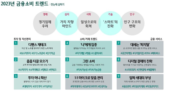 하나금융경영연구소가 제시하는 ‘2023년 금융소비 트렌드’는 ▲디펜스 재테크 ▲줍줍 티끌 모으기 ▲투자 머니 확산 ▲‘나’에게 집중 ▲그린 소비 ▲1:1 마이크로 맞춤 관리 ▲대세는 ‘피지털’(Physical+Digital), ▲디지털 결제의 진화 ▲‘알파 세대’의 부상이다.