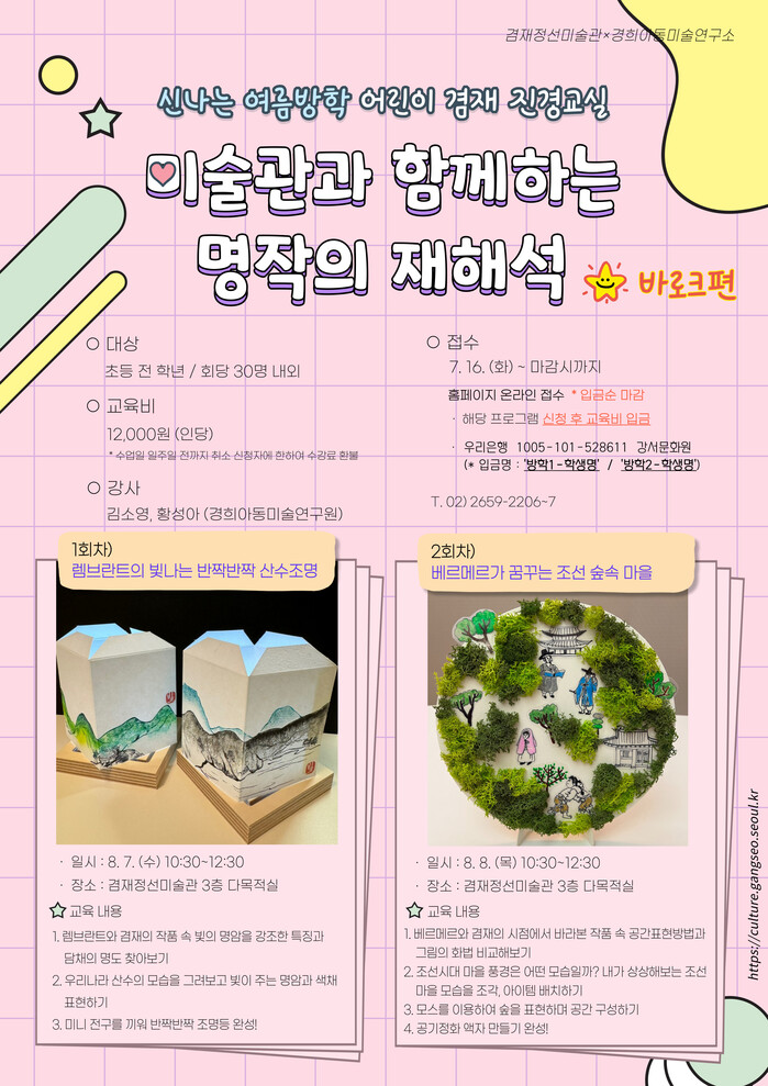 교육은 8월7~8일 오전 10시 30분부터 2시간 동안 진행된다. 참가비는 1만2000원으로 겸재정선미술관 홈페이지에서 선착순(회당 30명 내외) 모집 중이다.