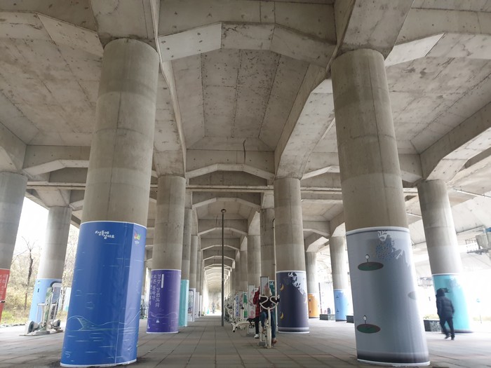 구는 공단과 지속협의 끝에 구조물 점검 및 시설물 유지보수를 실시하고 기존 페인트 벽화 방식을 벗어나 방치된 교각기둥에 디자인을 입힘으로써 도시경관 개선 효과도 높은 탈착식 벽화를 설치하게 되었다.