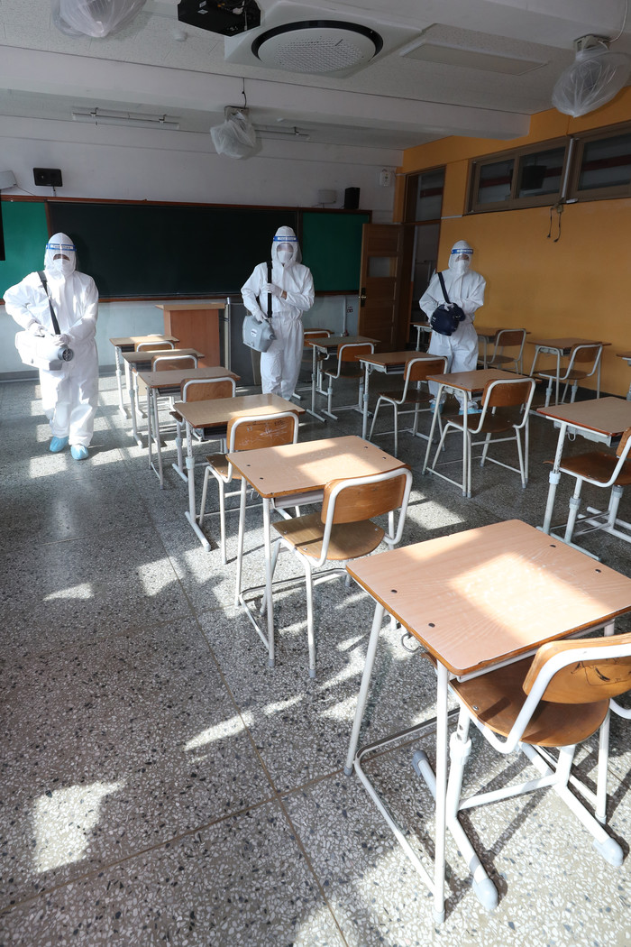 대학수학능력시험을 이틀 앞둔 16일 오전 광주 서구 화정동 광덕고등학교에서 방역업체 직원들이 고사장에 코로나19 예방 소독을 하고 있다.