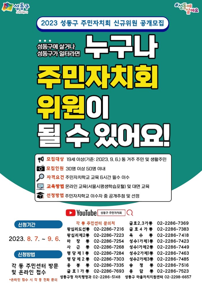 [시민일보 = 홍덕표 기자] 서울 성동구(구청장 정원오)는 오는 11월경 동시에 임기가 만료되는 17개 동 주민자치회 위원을 동별 최소 30명에서 최대 50명까지 공개 모집한다.