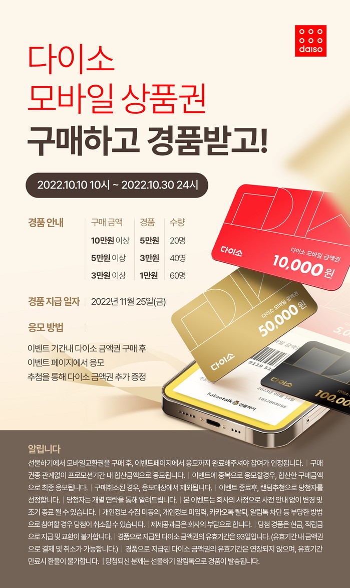 아성다이소에 따르면 이번 이벤트는 ‘다이소 모바일 상품권’을 구매 후 결제완료 페이지의 이벤트 배너에 접속해 응모를 하면 되고, 누적금액으로 3만원 이상부터 상품권 추첨이 가능하다.