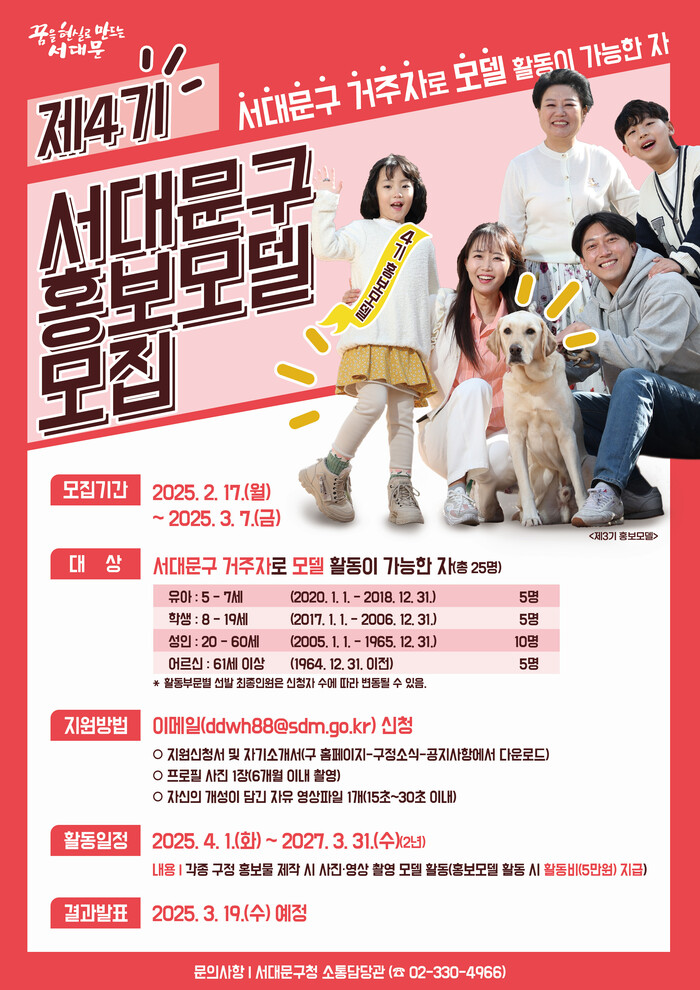 ‘제4기 서대문구 홍보모델’ 모집에 대한 자세한 내용은 서대문구청 소통담당관으로 문의하면 된다.