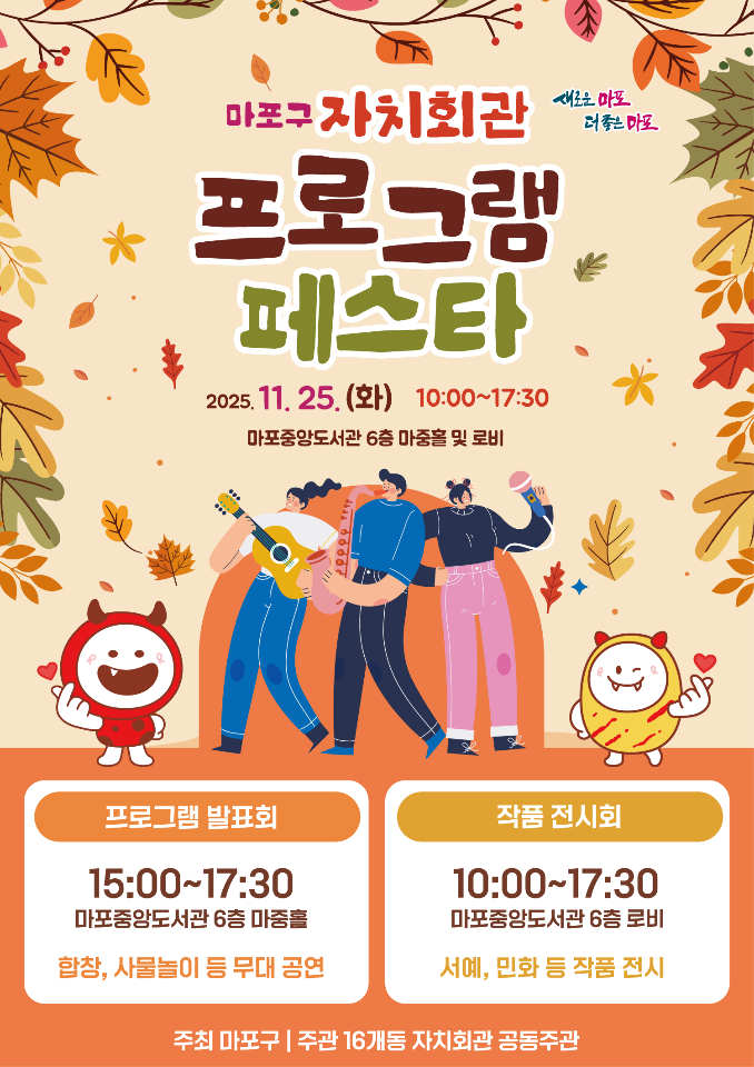[시민일보 = 문민호 기자] 마포구(구청장 박강수)는 오는 25일 마포중앙도서관에서 ‘자치회관 프로그램 페스타’를 개최한다.