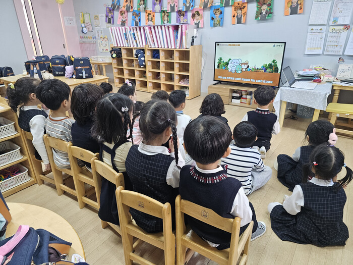 | ▲ 지역내 유치원에서 어린이들이 장애인식개선 교육 영상을 시청하고 있다. (사진=강서구청 제공) |