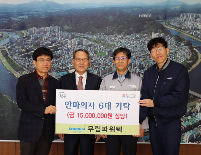 무림파워텍(주)(대표 이형수)는 21일 진주시복지재단(이사장 이성갑)에 지역사회와 취약계층에 안마의자 6대(환가액 1500여만 원 상당)를 기탁했다고 밝혔다.