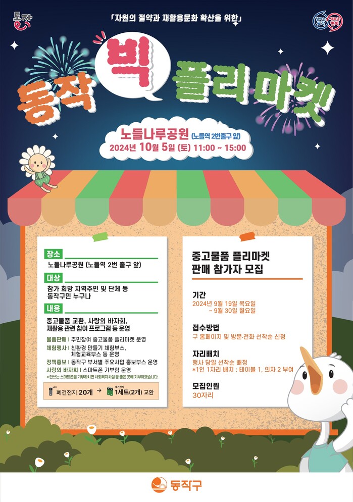 [시민일보 = 여영준 기자] 동작구(구청장 박일하)는 오는 10월5일 오전 11시~오후 3시 노들나루공원(노들역 2번 출구 앞)에서 ‘동작빅플리마켓’을 개최한다고 밝혔다.