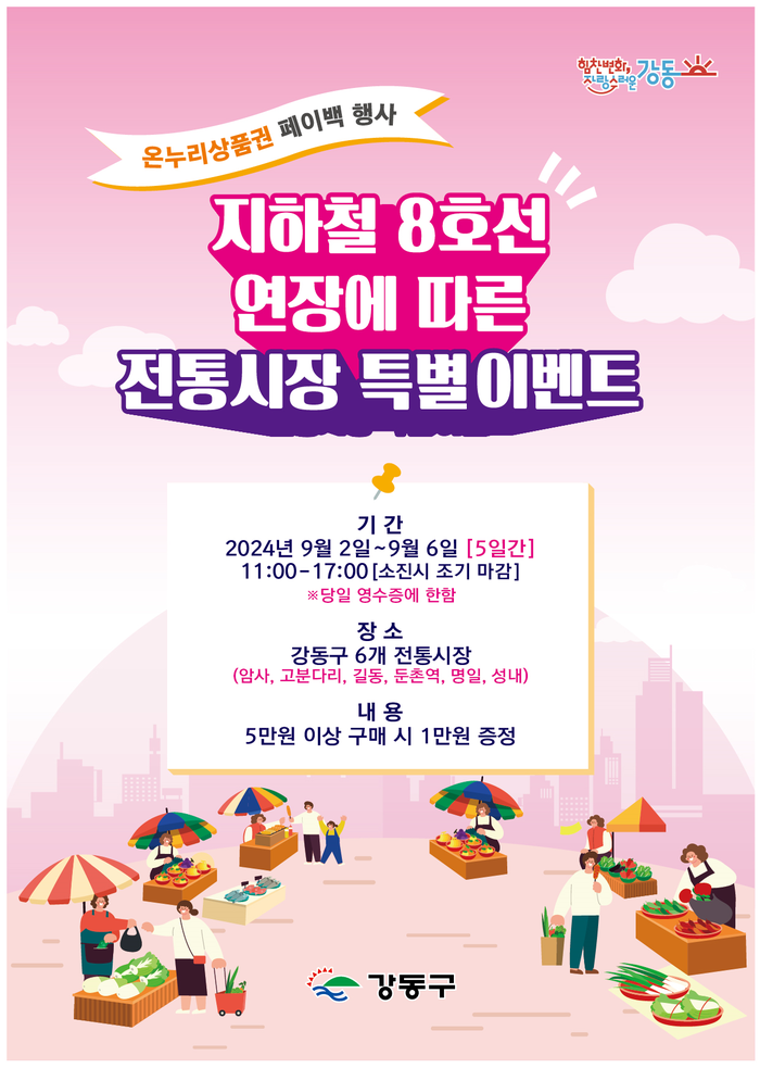 [시민일보 = 이대우 기자] 강동구(구청장 이수희)가 오는 9월2~6일 지역내 전통시장에서 ‘온누리상품권 페이백 행사’를 개최한다고 28일 밝혔다.