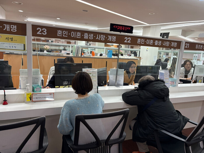 | ▲ 송파구 민원행정과 가족관계동록팀을 방문해 관련 행정서비스를 받는 주민들 모습. (사진=송파구청 제공) |